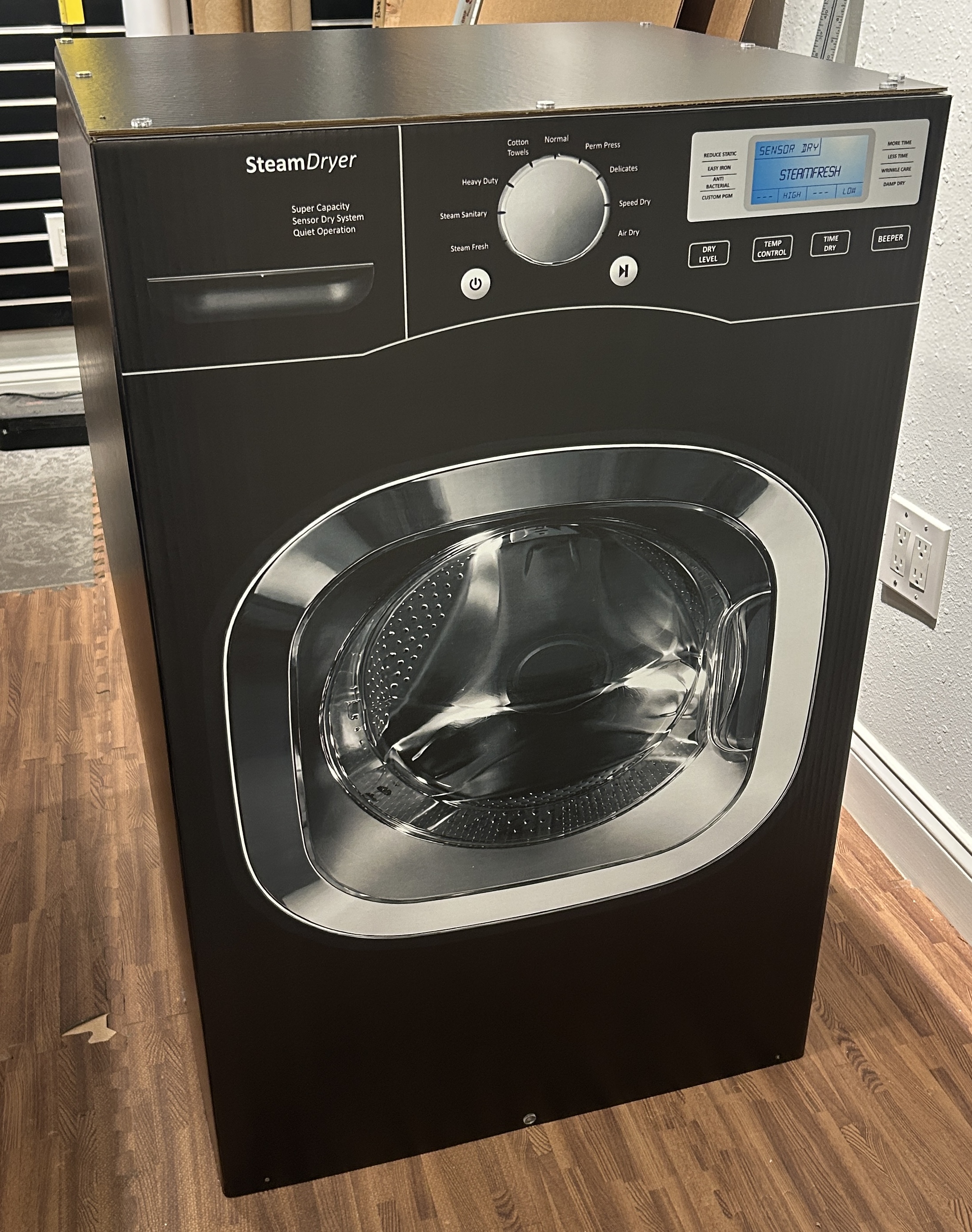 This cardboard washer is in full 3D. It measures 36" tall x 28" wide x 28"deep. All details are printed on the cardboard. Door does not open. Comes complete as a kit. Assembles in 20-30 mins. Made of printed cardboard. This washer prop is perfect for stage, theater, and retail displays. Custom sizes available. Call for details.
